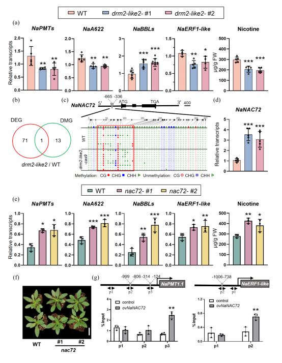 昆明植物所在DNA甲基化通過(guò)NaNAC72調(diào)控?zé)煵萆飰A的生物合成研究中取得進(jìn)展 文章來(lái)源:資源室 | 發(fā)布時(shí)間:2025-11-19 | 作者:佟阿慧、吳勁松 | 瀏覽次數(shù): | 【打印】 【關(guān)閉】 DNA甲基化是一種保守的表觀修飾,它可以調(diào)控很多基因的表達(dá)。已有研究表明,DNA甲基化參與次生代謝的生物合成調(diào)控,但是證據(jù)大多來(lái)自DNA甲基化抑制劑的處理。目前研究中缺乏DNA甲基化調(diào)控次生代謝物的遺傳證據(jù)和具體的調(diào)控機(jī)制。 尼古丁是煙草屬植物中含量最豐富的生物堿,在抵御植食性昆蟲方面發(fā)揮著關(guān)鍵作用。目前在栽培煙草(Nicotiana tabacum)的相關(guān)研究中已鑒定出多個(gè)正調(diào)控尼古丁合成的轉(zhuǎn)錄因子,如NtMYC2、NtERF189、NtERF199和NtMYB305a。與之相反,關(guān)于尼古丁合成負(fù)調(diào)控因子的報(bào)道則較少。因此,發(fā)現(xiàn)新的負(fù)調(diào)控因子不僅對(duì)于理解植物如何抵御植食性昆蟲至關(guān)重要,對(duì)于通過(guò)突變培育尼古丁含量可控的煙草品種也具有重要價(jià)值。 中國(guó)科學(xué)院昆明植物研究所植物次生代謝分子調(diào)控專題研究組此前的研究表明,二倍體野生煙草(N.?attenuata)中多數(shù)根特異性表達(dá)的尼古丁相關(guān)基因共享“DNA甲基化谷”特征(Tong?et al.,?2025)。但目前尚缺乏DNA甲基化調(diào)控尼古丁的系統(tǒng)研究。 因此,該研究首先探究了DNA甲基轉(zhuǎn)移酶的作用,發(fā)現(xiàn)沉默不同DNA甲基轉(zhuǎn)移酶基因?qū)δ峁哦『铣上嚓P(guān)基因表達(dá)影響不同,其中NaDRM2-like2沉默后關(guān)鍵酶基因NaPMTs及調(diào)控基因NaERF1-like表達(dá)顯著降低。進(jìn)而通過(guò)CRISPR/Cas9構(gòu)建的NaDRM2-like2突變體表現(xiàn)出尼古丁合成相關(guān)基因(NaPMTs、NaA622和NaERF1-like等)表達(dá)下調(diào)、葉片中尼古丁含量減少及對(duì)廣食性害蟲斜紋夜蛾(Spodoptera littoralis)更敏感的表型。 為揭示突變體尼古丁減少的原因,該研究通過(guò)全基因組重亞硫酸氫鹽測(cè)序(WGBS)和RNA測(cè)序,在14個(gè)差異甲基化的轉(zhuǎn)錄因子與72個(gè)差異表達(dá)的轉(zhuǎn)錄因子中篩選到一個(gè)共有基因——NaNAC72。在突變體中其啟動(dòng)子甲基化升高,同時(shí)表達(dá)量升高3倍以上。共表達(dá)分析顯示,NaNAC72與根特異性表達(dá)的尼古丁相關(guān)基因呈強(qiáng)負(fù)相關(guān)。 進(jìn)一步功能驗(yàn)證顯示,CRISPR/Cas9敲除NaNAC72可使葉片中尼古丁含量增加35%~42%,而過(guò)表達(dá)NaNAC72則抑制尼古丁合成相關(guān)基因表達(dá)并降低葉片尼古丁含量。凝膠阻滯實(shí)驗(yàn)與染色質(zhì)免疫沉淀實(shí)驗(yàn)證實(shí)NaNAC72可直接結(jié)合尼古丁關(guān)鍵合成酶基因NaPMT1.1及關(guān)鍵調(diào)控基因NaERF1-like的啟動(dòng)子,抑制其轉(zhuǎn)錄活性。 綜上,該研究得出結(jié)論:DNA甲基轉(zhuǎn)移酶基因的沉默會(huì)影響尼古丁相關(guān)基因表達(dá);NaNAC72是尼古丁生物合成的新負(fù)調(diào)控因子。該發(fā)現(xiàn)為解析防御代謝物的表觀遺傳調(diào)控機(jī)制及培育尼古丁含量可控的煙草品種提供了新視角與靶點(diǎn)。 相關(guān)研究成果以Transcriptional Activation of NaNAC72 Suppresses Nicotine Biosynthesis in DNA Methyltransferase NaDRM2-like2 Mutants of Nicotiana attenuata為題,在Plant Biotechnology Journal在線發(fā)表。中國(guó)科學(xué)院昆明植物研究所博士研究生佟阿慧為論文第一作者,吳勁松研究員和王蕾研究員為論文共同通訊作者,云南煙草農(nóng)業(yè)科學(xué)院王丙武副研究員,已畢業(yè)碩士研究生李榮平和云南民族大學(xué)客座碩士研究生茶學(xué)局參與此項(xiàng)研究。研究得到了云南基礎(chǔ)研究重大計(jì)劃(編號(hào)202401BC070015)等項(xiàng)目支持。