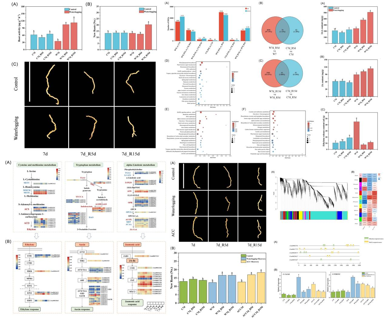 圖1?附生型與地生型蘭屬植物對水澇脅迫響應(yīng)的多組學(xué)分析 水澇脅迫后的恢復(fù)能力對提高植物耐受性具有關(guān)鍵作用。研究團(tuán)隊(duì)進(jìn)一步聚焦于對水澇敏感的西藏虎頭蘭,探究其水澇脅迫后的恢復(fù)機(jī)制。研究發(fā)現(xiàn),西藏虎頭蘭在水澇后恢復(fù)過程中會(huì)被誘導(dǎo)形成大量側(cè)根,這與其根系功能修復(fù)和活力恢復(fù)同步。轉(zhuǎn)錄組分析和植物激素檢測表明,水澇期積累的乙烯在恢復(fù)初期發(fā)揮了早期信號作用。通過外源施加乙烯前體ACC實(shí)驗(yàn)證實(shí),乙烯能夠直接誘導(dǎo)西藏虎頭蘭形成側(cè)根,并同時(shí)激活茉莉酸信號轉(zhuǎn)導(dǎo)途徑。加權(quán)基因共表達(dá)網(wǎng)絡(luò)分析進(jìn)一步鎖定?CtNAC68?和?CtWRKY65?兩個(gè)關(guān)鍵轉(zhuǎn)錄因子作為乙烯-茉莉酸信號交叉對話的核心樞紐,調(diào)控側(cè)根發(fā)育相關(guān)基因的表達(dá)。這一發(fā)現(xiàn)首次在附生型蘭花中揭示了水澇后通過乙烯-茉莉酸信號通路協(xié)同驅(qū)動(dòng)側(cè)根形成的適應(yīng)機(jī)制,為理解其生態(tài)適應(yīng)提供了新視角。相關(guān)成果以Ethylene promotes lateral root formation following waterlogging in an epiphytic orchid,Cymbidium tracyanum為題發(fā)表于Plant Physiology and Biochemistry(DOI: 10.1016/j.plaphy.2025.110575)。昆明植物研究所博士研究生高天陽和已畢業(yè)碩士研究生劉寧宇為論文第一作者,張石寶研究員為通訊作者,博士后涂夢玲和碩士研究生羅海翠參與了研究工作。
