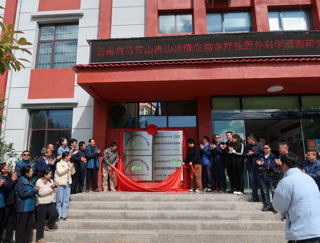 活動(dòng)最后,王兵首席和與會(huì)領(lǐng)導(dǎo)及代表在白馬雪山國家級(jí)自然保護(hù)區(qū)管護(hù)局,共同為“中國森林生態(tài)系統(tǒng)定位觀測研究網(wǎng)絡(luò)云南白馬雪山高山冰緣生物多樣性野外科學(xué)觀測研究站”“森林生態(tài)系統(tǒng)野外臺(tái)站國家系列標(biāo)準(zhǔn)宣貫活動(dòng)基地”“中國森林生態(tài)系統(tǒng)定位觀測研究網(wǎng)絡(luò)森林全口徑碳中和監(jiān)測迪慶分中心”“山水林田湖草生態(tài)產(chǎn)品監(jiān)測評(píng)估與價(jià)值化實(shí)現(xiàn)路徑設(shè)計(jì)前瞻計(jì)劃生態(tài)產(chǎn)品‘四庫’大數(shù)據(jù)源監(jiān)測基地”揭牌。