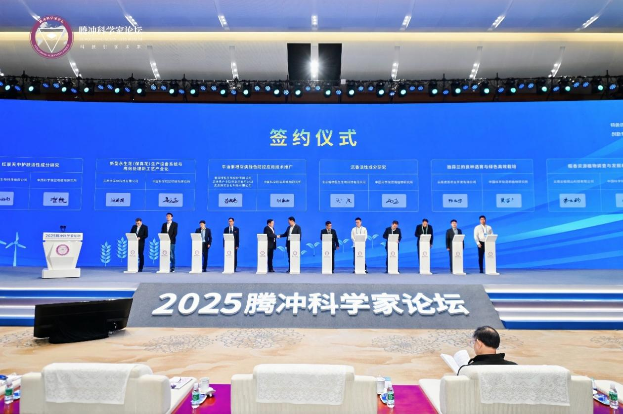 郝小江院士作主旨報(bào)告? 為進(jìn)一步促進(jìn)成果轉(zhuǎn)化,論壇還設(shè)置了成果簽約與發(fā)布環(huán)節(jié),包括中國科學(xué)院昆明植物研究所的牛油果根腐病綠色防控、沉香活性成分研究、紅景天中護(hù)膚活性成分研究、新型永生花(保真花)生產(chǎn)設(shè)備系統(tǒng)與高效處理新工藝產(chǎn)業(yè)化、獨(dú)蒜蘭的良種選育與綠色高效栽培、糯香資源植物調(diào)查與發(fā)掘利用項(xiàng)目,云南省農(nóng)科院的滬滇花卉特色種質(zhì)資源及產(chǎn)業(yè)化成果轉(zhuǎn)化、高原蜜薯科技創(chuàng)新與轉(zhuǎn)化應(yīng)用、咖啡綠色高效栽培技術(shù)項(xiàng)目,紅河州農(nóng)業(yè)農(nóng)村局的金毛狗脊全產(chǎn)業(yè)鏈高質(zhì)量發(fā)展示范項(xiàng)目,以及云南省林科院的西南干熱河谷竹葉花椒良種選育與輕簡化高效栽培技術(shù)、云南森林蔬菜資源挖掘與產(chǎn)業(yè)化利用、甜龍竹筍采后活體保鮮貯藏及生物活性研究與應(yīng)用等10余項(xiàng)成果簽約和發(fā)布。簽約項(xiàng)目精準(zhǔn)聚焦生物多樣性保護(hù)與現(xiàn)代農(nóng)業(yè)協(xié)同發(fā)展核心領(lǐng)域,是政產(chǎn)學(xué)研深度融合的生動實(shí)踐,更是推動科技賦能農(nóng)業(yè)高質(zhì)量發(fā)展的有力舉措,必將為區(qū)域農(nóng)業(yè)綠色轉(zhuǎn)型、生態(tài)保護(hù)與經(jīng)濟(jì)增收注入強(qiáng)勁新動能。