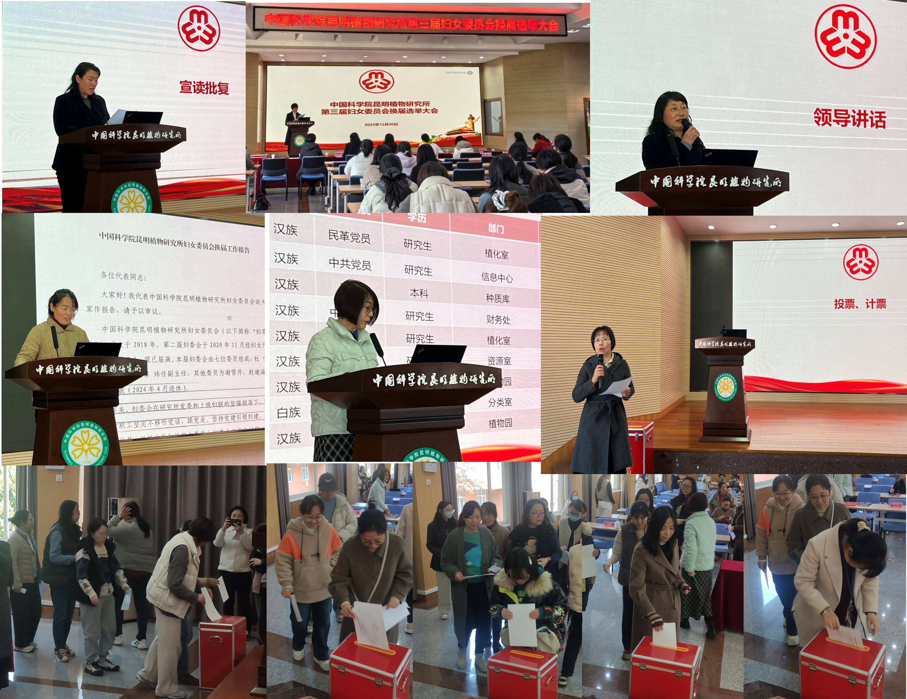 昆明植物所第三屆婦女委員會(huì)換屆選舉大會(huì)順利召開 文章來源:婦委會(huì) | 發(fā)布時(shí)間:2026-01-04 | 作者: | 瀏覽次數(shù): | 【打印】 【關(guān)閉】 12月30日,中國科學(xué)院昆明植物研究所第三屆婦女委員會(huì)換屆選舉大會(huì)勝利召開,大會(huì)應(yīng)到會(huì)婦女代表57名,實(shí)到會(huì)有選舉權(quán)代表54名。昆明分院婦委會(huì)主任趙娜、昆明植物所黨委副書記、紀(jì)委書記廖雷青出席大會(huì)。部分黨支部、工會(huì)組長代表受邀參會(huì)。會(huì)議由第二屆婦委會(huì)委員王蕾主持。 大會(huì)在莊嚴(yán)的國歌聲中拉開帷幕。與會(huì)代表認(rèn)真聽取并審議通過了《中國科學(xué)院昆明植物研究所第二屆婦女委員會(huì)工作報(bào)告》。昆明分院趙娜主任宣讀《中國科學(xué)院昆明分院機(jī)關(guān)婦女委員會(huì)關(guān)于中國科學(xué)院昆明植物研究所第三屆婦女委員會(huì)換屆選舉的批復(fù)》。黨辦主持工作副主任馮石宣讀了第三屆婦委會(huì)委員候選人及《中國科學(xué)院昆明植物研究所第三屆婦女委員會(huì)委員選舉辦法》,并通過大會(huì)審議。大會(huì)還審議產(chǎn)生了總監(jiān)票人、總計(jì)票人、監(jiān)票人和計(jì)票人。 根據(jù)選舉辦法,大會(huì)采取無記名投票方式,選舉產(chǎn)生第三屆婦委會(huì)委員7名。按姓氏筆畫為序,王永翠、杜寧、李培、張馨元、趙逾涵、常瑋、謝雪丹7位同志當(dāng)選第三屆婦委會(huì)委員。 會(huì)上,廖雷青書記向研究所第二屆婦委會(huì)表示感謝,同時(shí)也希望第三屆婦委會(huì)能夠立足崗位多做貢獻(xiàn),以服務(wù)全所女職工為出發(fā)點(diǎn)開展各項(xiàng)工作,培育先進(jìn)典型,充分發(fā)揮先進(jìn)性和主動(dòng)性,引領(lǐng)科技創(chuàng)新,帶領(lǐng)廣大婦女同志強(qiáng)化攻堅(jiān)意識(shí),扛起攻堅(jiān)責(zé)任,以巾幗之姿扛起使命擔(dān)當(dāng),為研究所的蓬勃發(fā)展、行穩(wěn)致遠(yuǎn)注入巾幗力量。會(huì)后召開了第三屆婦委會(huì)第一次會(huì)議。